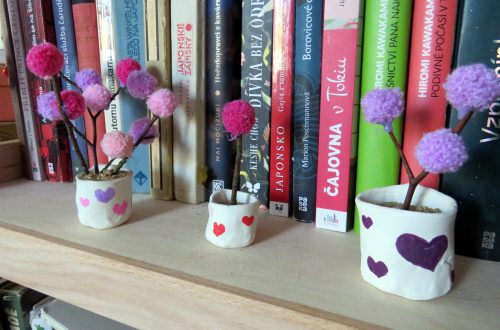 Měli jsme chuť si vyrobit něco pěkného, barevného a možná i trochu zamilovaného (to hlavně já). Koupila jsem u nás v krámečku na rohu pár mini květináčků a několik jsem jich vyrobila z na vzduchu schnoucí hmoty. Akrylovými fixami jsme je s dětmi pomalovali. Do kůlny jsem doběhla pro trochu písku a na zahrádku pro pár větviček. Písek jsme nasypali do květináčků a větvičky nalámali na malé stromečky. Konečně přišly na řadu maličké, roztomilé bambulky , které jsem nedávno pořídila v Kiku. V hlavní roli – tavná pistole. A je to!! Můj skřítek přidal na svůj stromek dokonce i malou okatou příšerku. Děti si hned vzpomněly na pohádku Lorax tak…