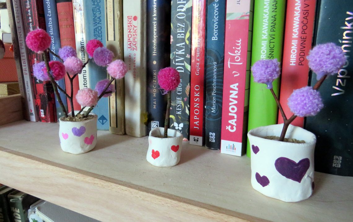 Měli jsme chuť si vyrobit něco pěkného, barevného a možná i trochu zamilovaného (to hlavně já). Koupila jsem u nás v krámečku na rohu pár mini květináčků a několik jsem jich vyrobila z na vzduchu schnoucí hmoty. Akrylovými fixami jsme je s dětmi pomalovali. Do kůlny jsem doběhla pro trochu písku a na zahrádku pro pár větviček. Písek jsme nasypali do květináčků a větvičky nalámali na malé stromečky. Konečně přišly na řadu maličké, roztomilé bambulky , které jsem nedávno pořídila v Kiku. V hlavní roli – tavná pistole. A je to!! Můj skřítek přidal na svůj stromek dokonce i malou okatou příšerku. Děti si hned vzpomněly na pohádku Lorax tak…