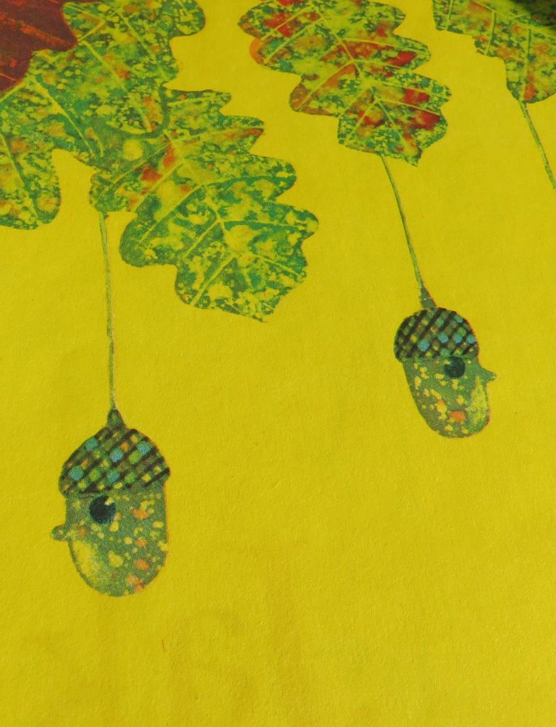 Na cca 30. stránkách si tenhle malý chlapec pohraje se všemi možnými plody podzimu. Žaludy, kaštany, šípky, jeřabinky a šišky….