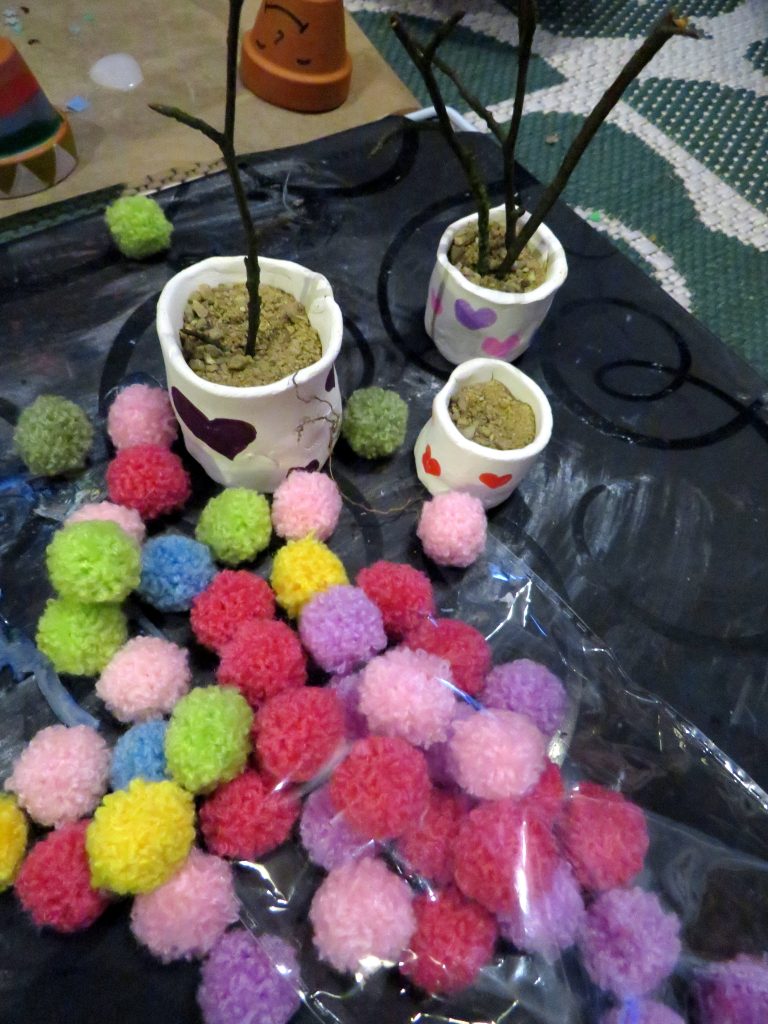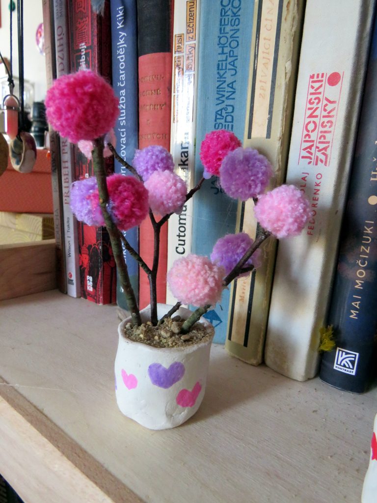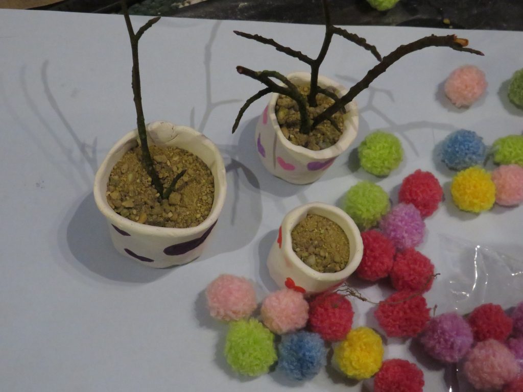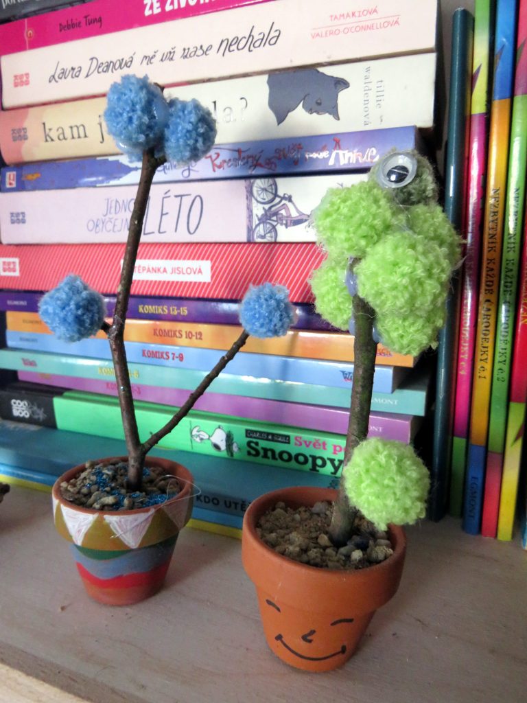 Písek jsme nasypali do květináčků a větvičky nalámali na malé stromečky. Konečně přišly na řadu maličké, roztomilé bambulky , které jsem nedávno pořídila v Kiku. V hlavní roli – tavná pistole.