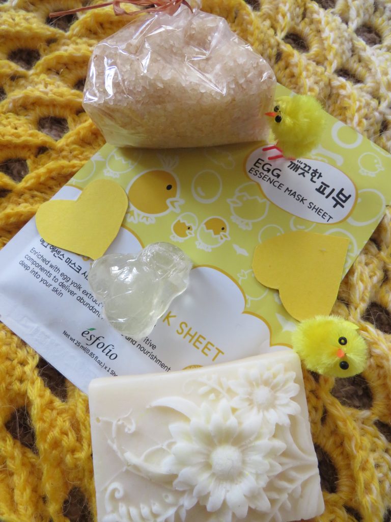 Sluníčkově žlutou mám i doma, je to barva jarní péče. Maska na obličej, domácí mýdla a sůl do koupele. A kuřátka 🙂